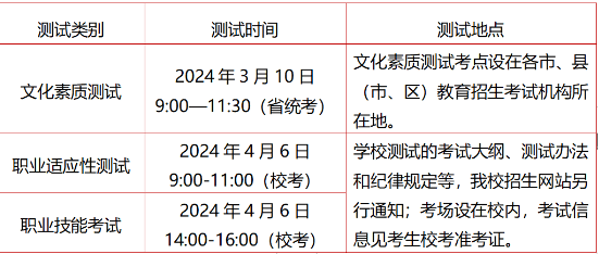分类考试招生实行“文化素质+职业技能”的考试评价方式,所有报考我校考生,除符合文化素质测试免试政策的考生外,均须参加文化素质测试。文化素质测试由省教育招生考试院统一组织并划定合格分数线。我校将在考生文化素质测试合格基础上,依据文化素质测试成绩从高分到低分,分别按专业面向普通高中毕业生、中职毕业生计划数1:5的比例,确定参加我校组织的职业技能考试(或职业适应性测试)校考资格线,并于2024年4月3日前在我校招生网公布。普通高中毕业生及其他类别考生参加职业适应性测试;中职毕业生参加职业技能考试。